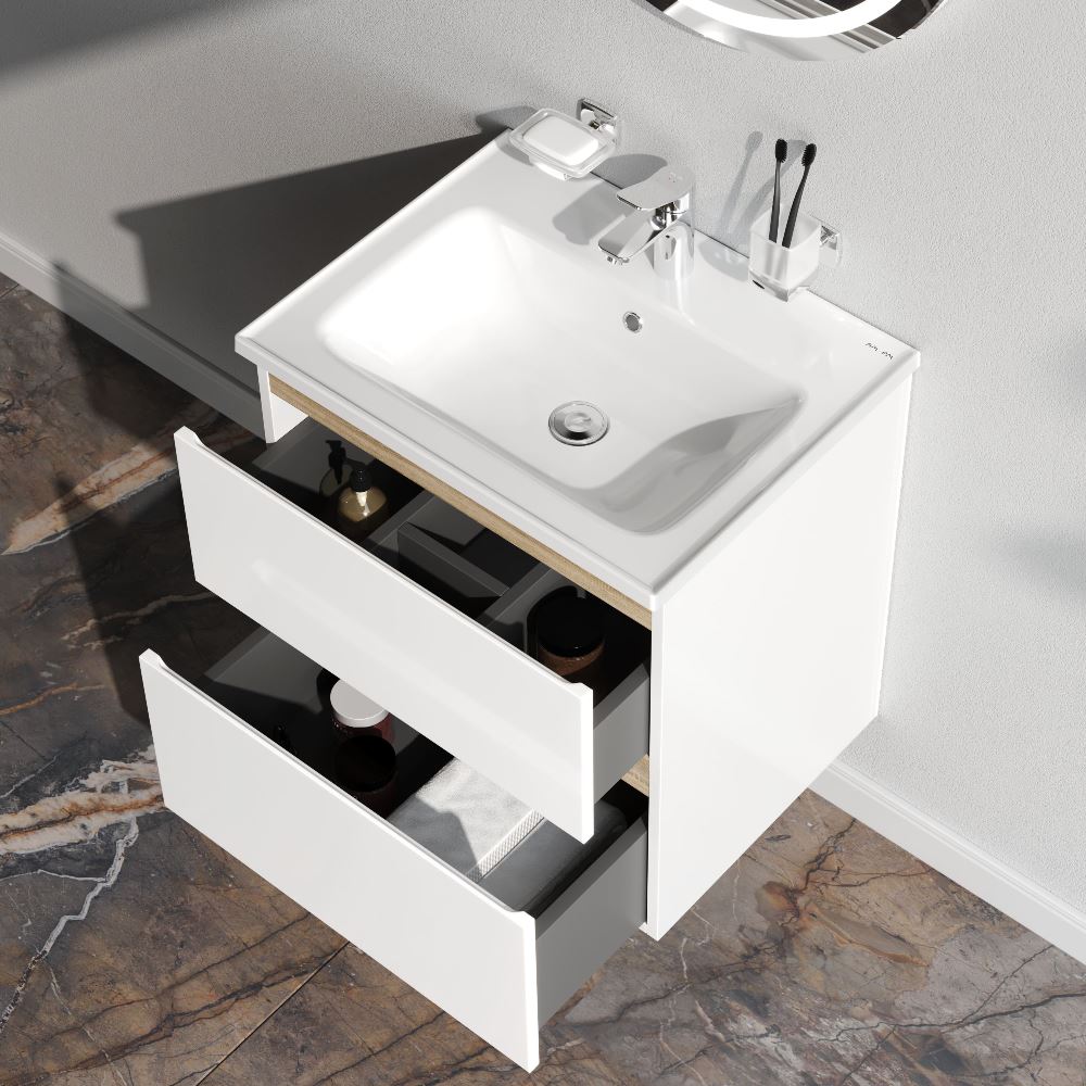 - Подвесная тумба помогает сэкономить место в ванной комнате, визуально увеличивая пространство. Установка на удобной высоте. Оптимизация хранения вещей внутри ящиков. Грамотно расположенные скрытые коммуникации внутри тумбы. бортик по контуру раковины препятствует проливу воды за мебель.
