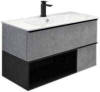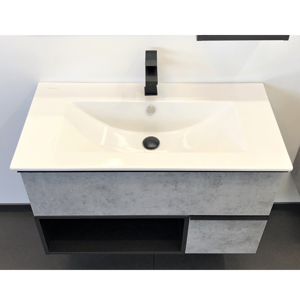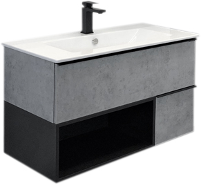 - Тумба-умывальник в современном стиле с двумя выкатными ящиками и пространством для открытого хранения. На ящиках тумбы черные матовые алюминиевые ручки