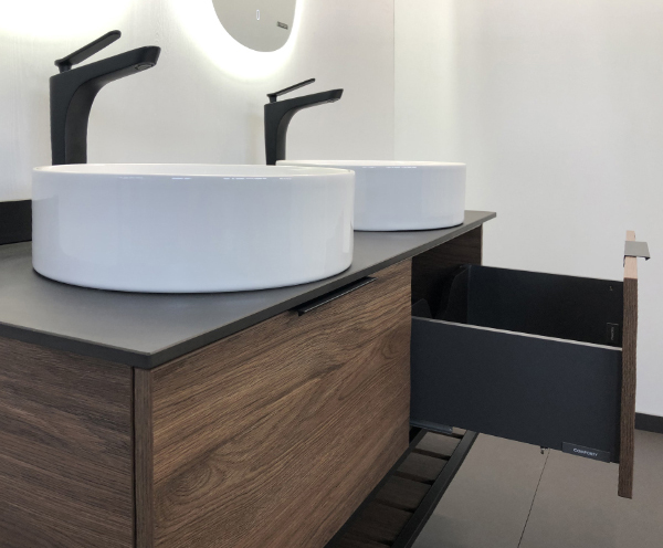Для изготовления корпусов и фасадов мебели Comforty используются только влагостойкие ЛДСП. Фасады и другие элементы, выполненные из МДФ, окрашены в несколько слоев полиуретановыми или полиэфирными грунтами и эмалями. Для придания глянцевого блеска поверхность фасада шлифуется и подвергается механической полировке. При изготовлении некоторых деталей мебели используется также и качественная натуральная древесина.Мебельные ручки оригинальных форм имеют глянцевое хромирование, либо гальваническое чернение и отлично сочетаются со смесителями и другими аксессуарами ванной комнаты. Мебель комплектуется дверными петлями clip-on со встроенными доводчиками, драйвер- боксами и направляющими плавного закрывания. Зеркальные полотна с толщиной стекла не менее 4 мм и серебряной амальгамой не боятся влаги и дают идеальное глубокое отра