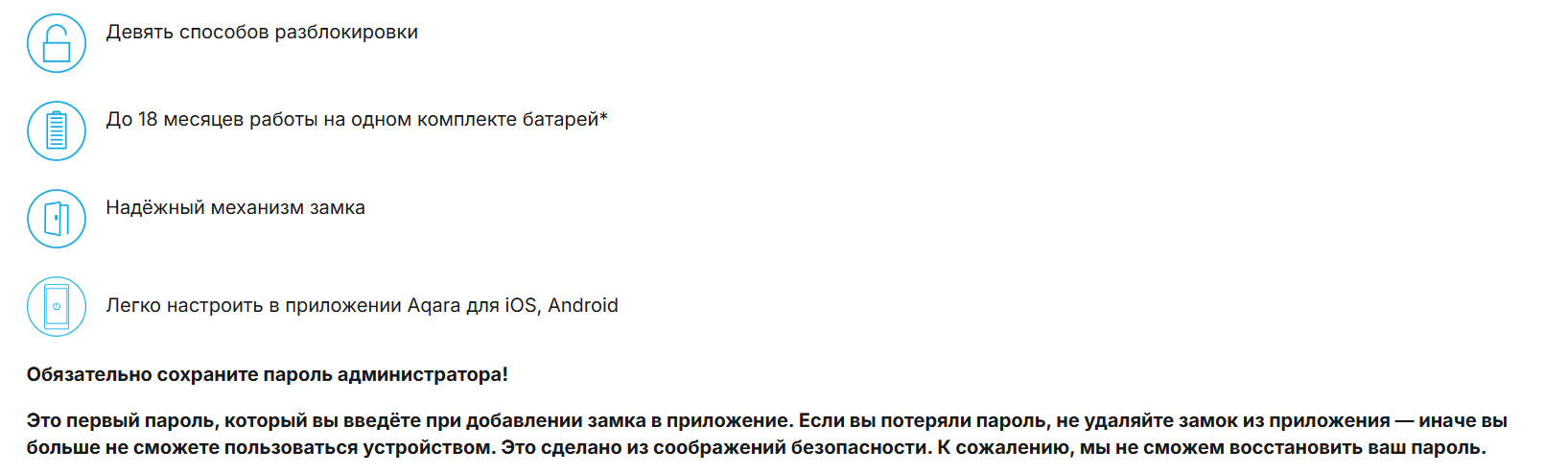 Замок работает на 8 батареях типа АА, которых хватит на срок до 18 месяцев. В любом случае А100 заранее напомнит о низком заряде. Но даже если батареи сели, вы всё равно сможете открыть замок с помощью механического ключа или запитать его через порт Type-C.