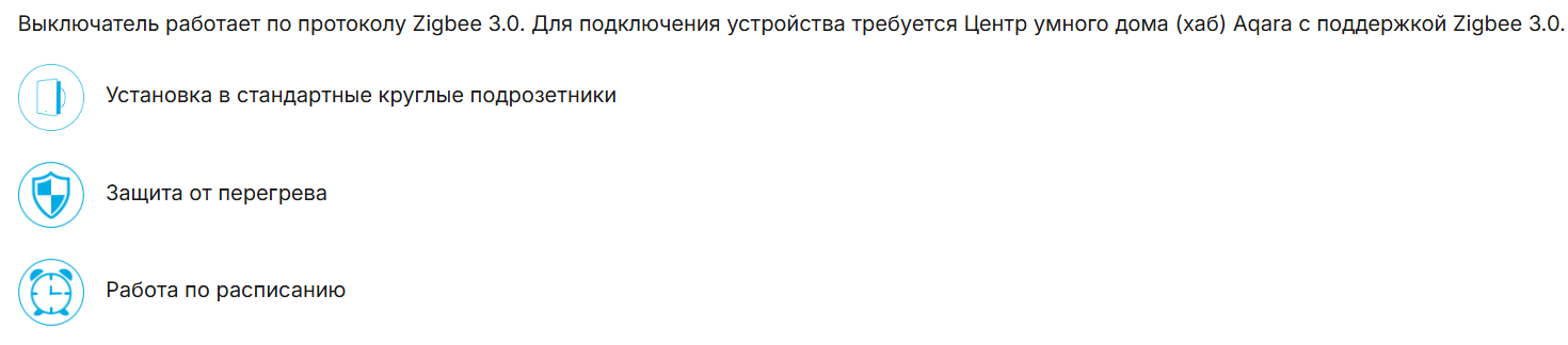 Выключатель работает по протоколу Zigbee 3.0. Для подключения устройства требуется Центр умного дома (хаб) Aqara с поддержкой Zigbee 3.0.