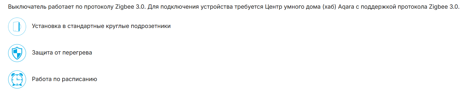 Выключатель работает по протоколу Zigbee 3.0. Для подключения устройства требуется Центр умного дома (хаб) Aqara с поддержкой Zigbee 3.0.