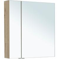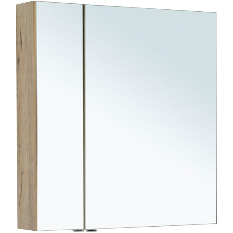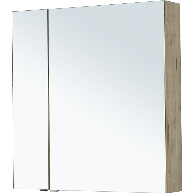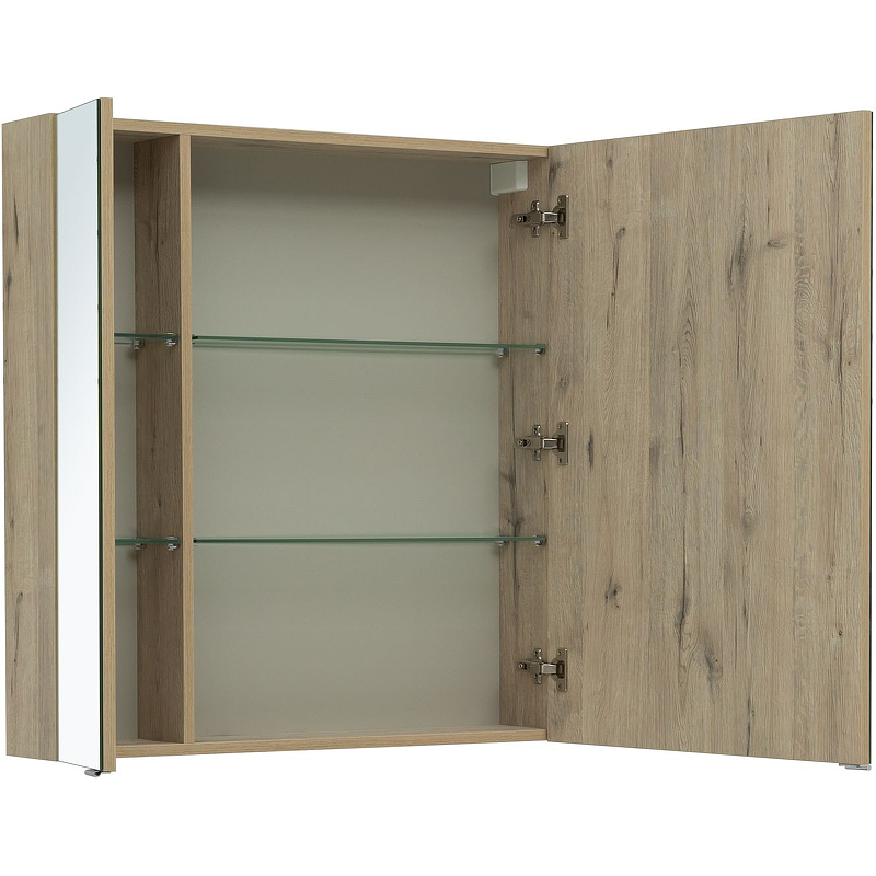 Зеркало-шкаф Aquanet «Алвита» New 80 — современная модель в корпусе из ЛДСП, окрашенном в цвет «дуб веллингтон белый». Фасады выполнены из комбинации МДФ и стекла. Снаружи располагаются две дверцы. Внутри — две секции разного размера. Каждая из них поделена полками на три части. На них удобно хранить косметические принадлежности — ватные палочки, спонжи, пены и лосьоны для бритья.