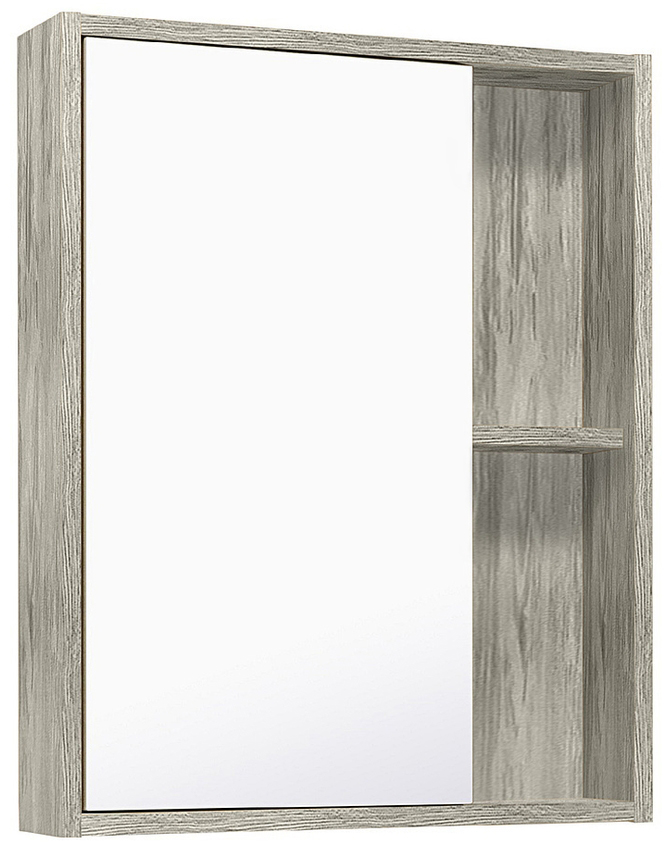 - Шкафчик в ванную имеет одну распашную дверцу с зеркальным фасадом и две открытые полки.
