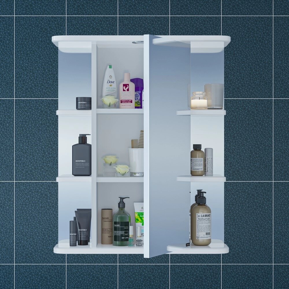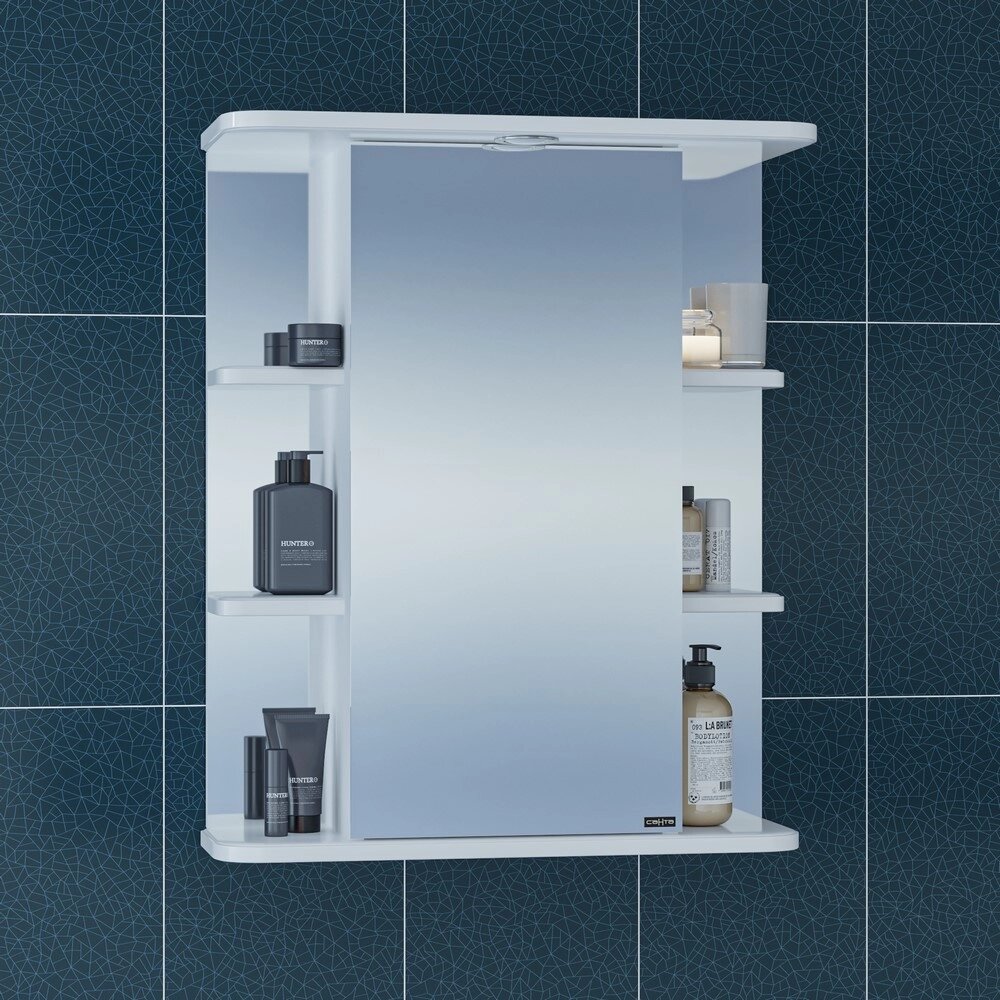- Конструкция визуально разделена на две части – открытую секцию с двумя полочками и просторный шкаф за зеркальной дверцей