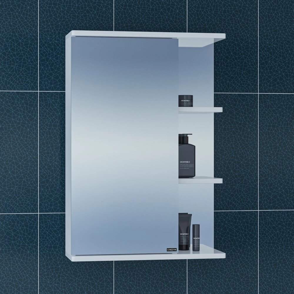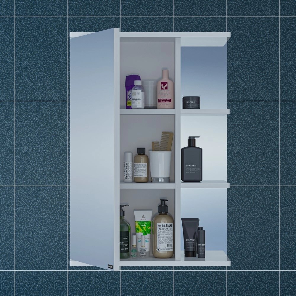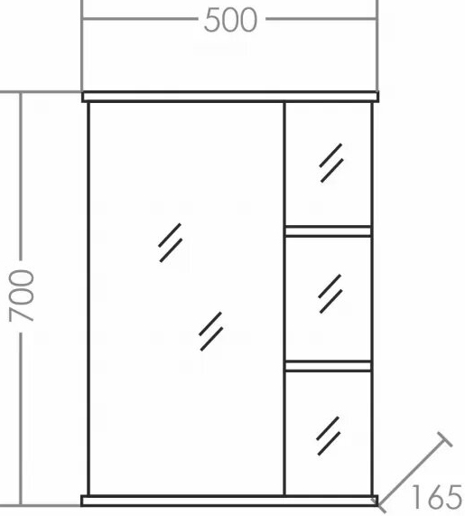 - Конструкция состоит из двух открытых полок и узкой секции за распашной дверцей