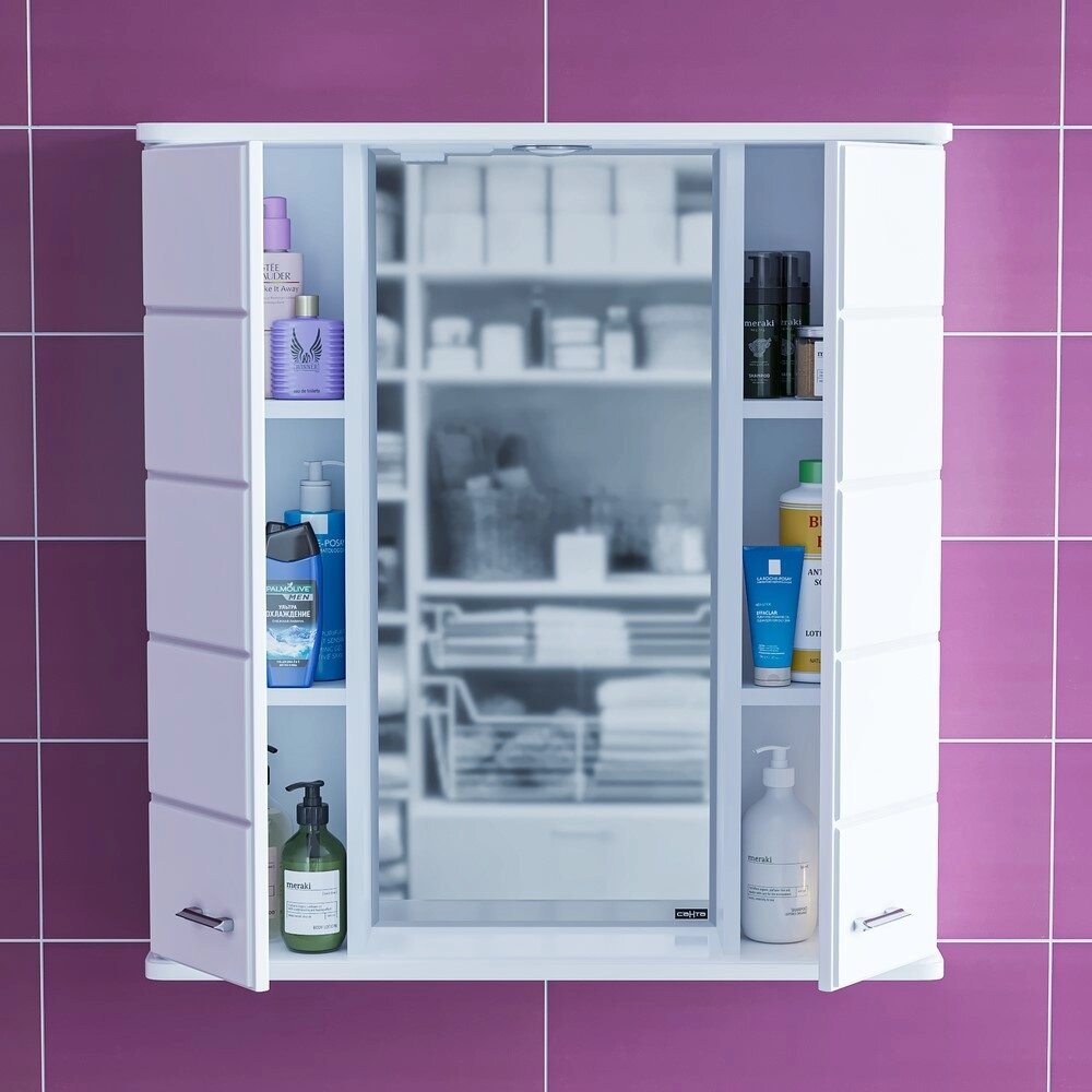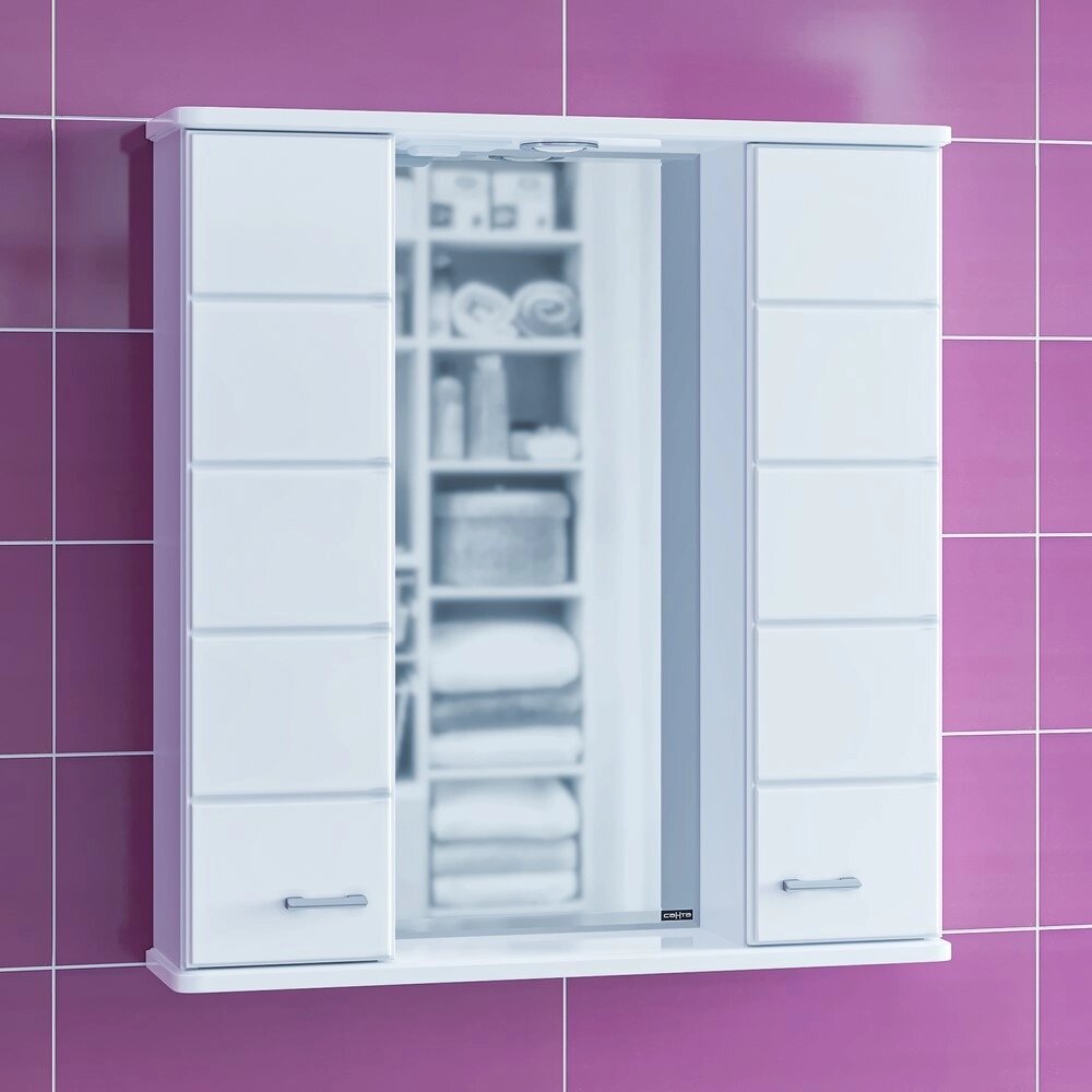 - С обеих сторон зеркало Омега обрамляют два распашных шкафчика с вкладными полками. В них можно хранить мелкие косметические и гигиенические средства