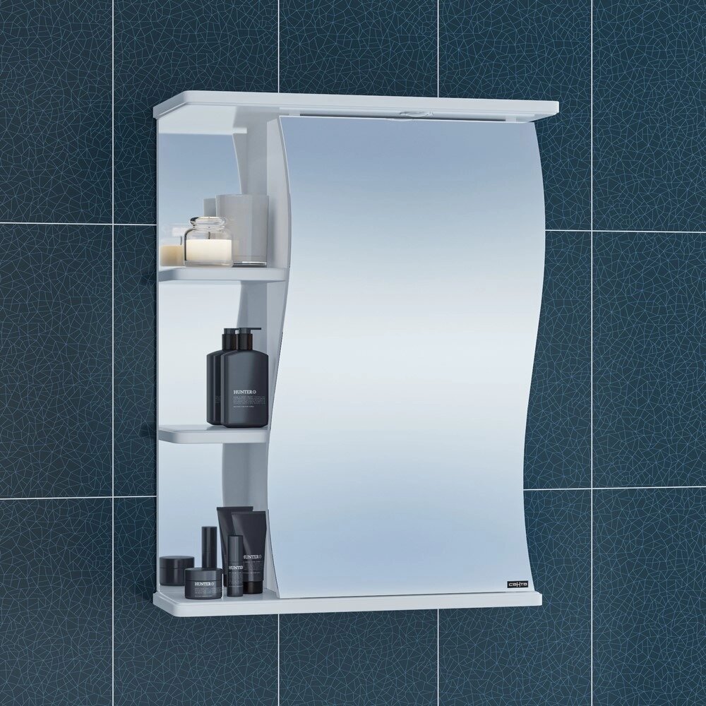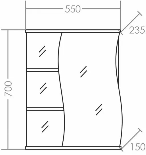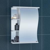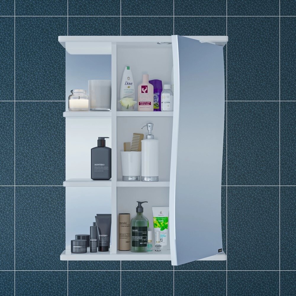 - Волнообразная геометрия зеркального полотна пересекается с названием коллекции. Помимо эстетической составляющей, изделие обладает хорошей функциональностью. Шкаф за зеркальной дверцей и открытые полочки способны вместить множество необходимых мелочей
