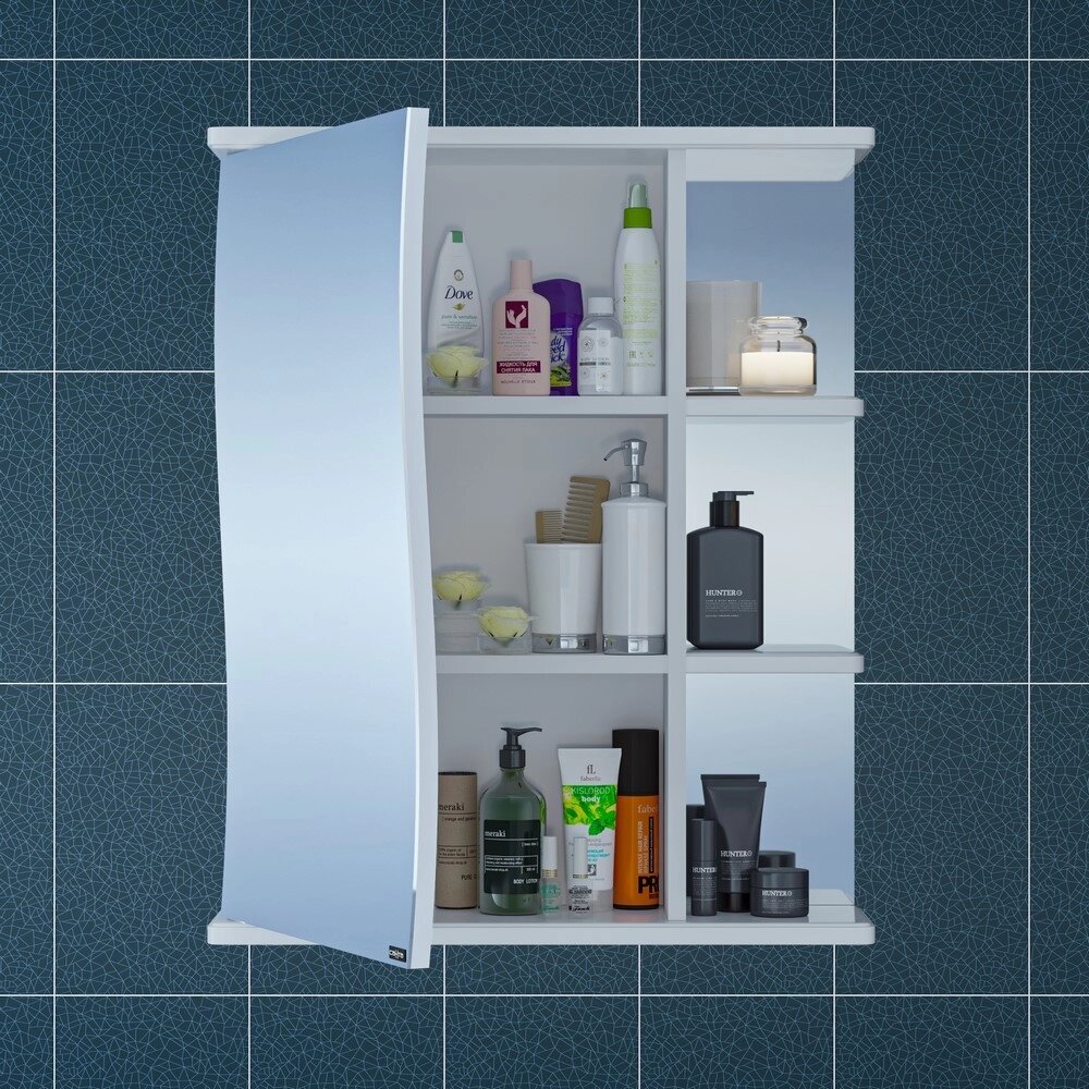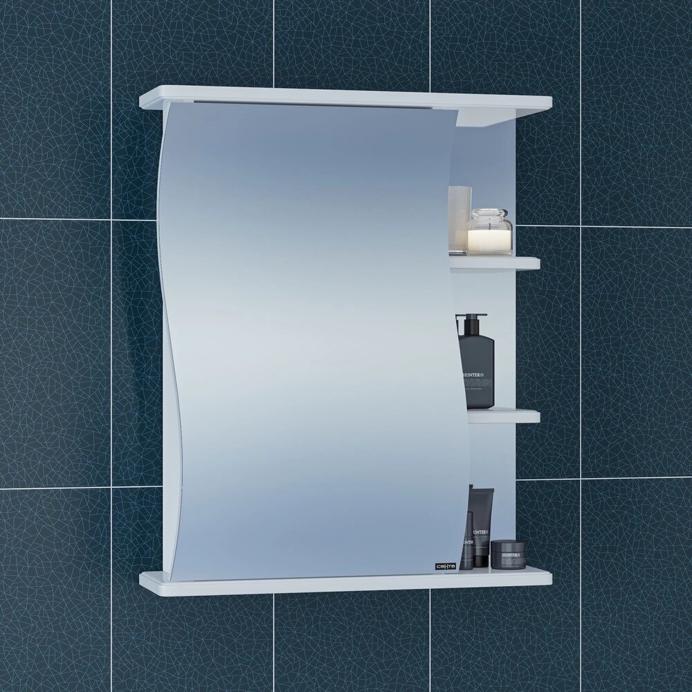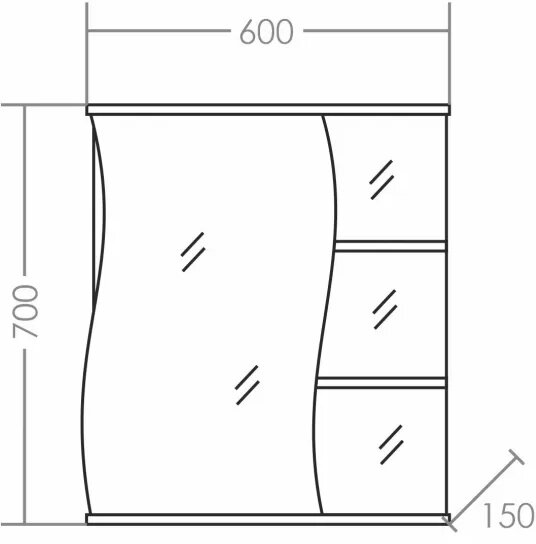 - Волнообразная геометрия зеркального полотна пересекается с названием коллекции. Помимо эстетической составляющей, изделие обладает хорошей функциональностью. Шкаф за зеркальной дверцей и открытые полочки способны вместить множество необходимых мелочей