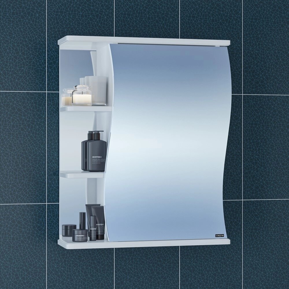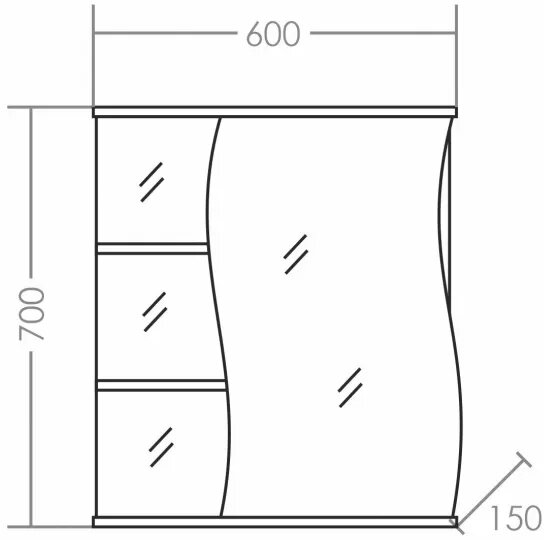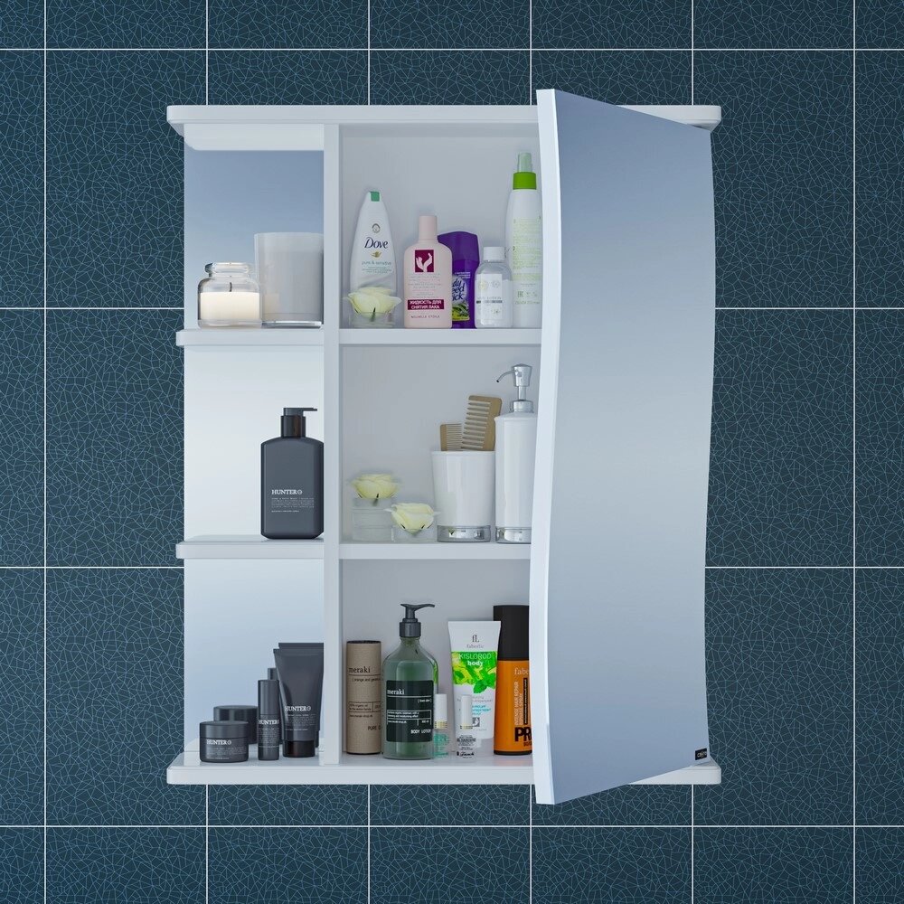 - Волнообразная геометрия зеркального полотна пересекается с названием коллекции. Помимо эстетической составляющей, изделие обладает хорошей функциональностью. Шкаф за зеркальной дверцей и открытые полочки способны вместить множество необходимых мелочей